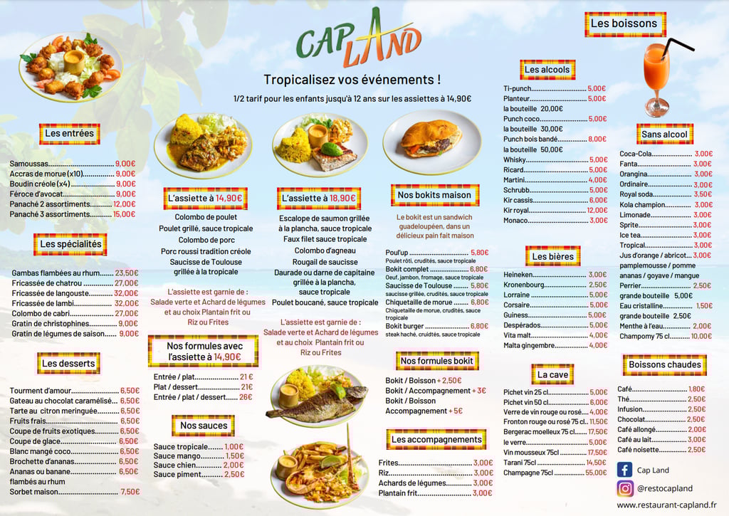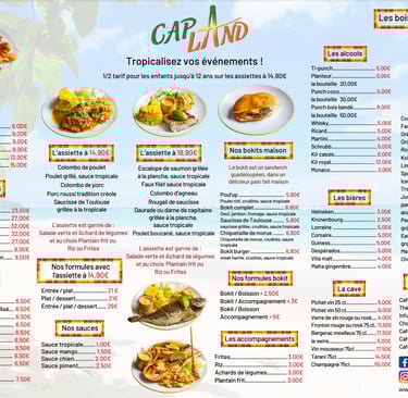 Découvrez notre carte riche et variée, mettant en avant le meilleur de la cuisine créole et des saveurs des Caraïbes. Chez Cap Land, chaque plat est préparé avec des ingrédients frais et une touche d'authenticité, pour offrir une expérience culinaire unique.